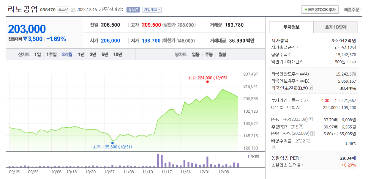 리노공업 주가 분석