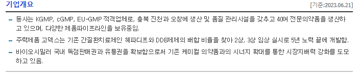 -동사는 KGMP, cGMP, EU-GMP 적격업체로, 충북 진천과 오창에 생산 및 품질 관리시설을 갖추고 40여 전문의약품을 생산하고 있으며, 다양한 제품파이프라인을 보유중임. 주력제품 고덱스는 기존 간질환치료제인 헤파디프와 DDB제제의 배합 비율을 찾아 2상, 3상 임상 실시로 5년 노력 끝에 개발함. 바이오시밀러 국내 독점판매권과 유통권을 확보함으로써 기존 케미컬 의약품과의 시너지 확대를 통한 시장지배력 강화를 도모하고 있음.