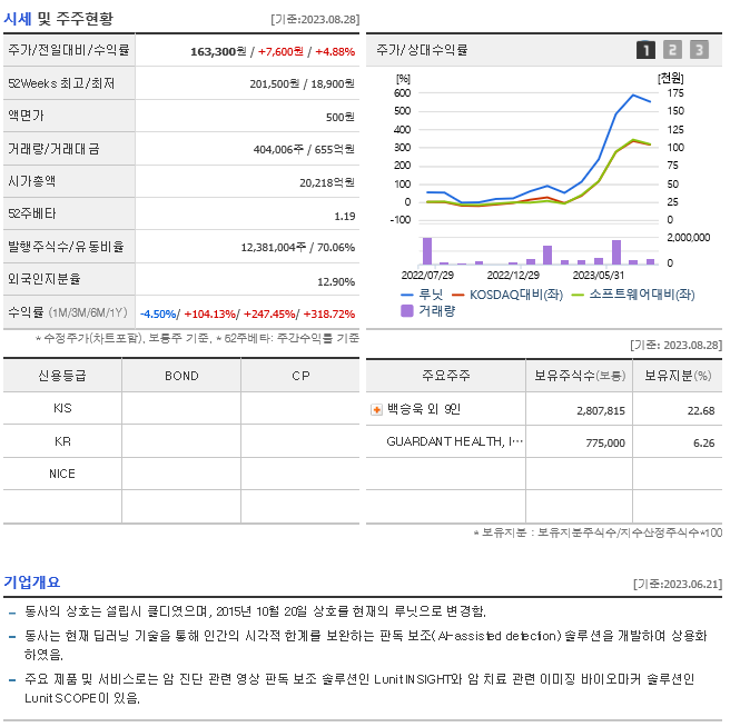 -2023년 3월 전년동기 대비 연결기준 매출액은 268.6% 증가, 영업손실은 82.2% 감소, 당기순손실은 90.4% 감소. 의료영상 기반의 새로운 바이오마커를 찾아내는 이미징 바이오마커(AI imaging biomarker) 솔루션 개발함. Lunit SCOPE의 경우 2022년 4월 Lunit SCOPE PD-L1 TPS가 유럽 CE인증을 획득하였으며, 이외에도 추가적인 인허가를 위해 임상 시험 준비 중.