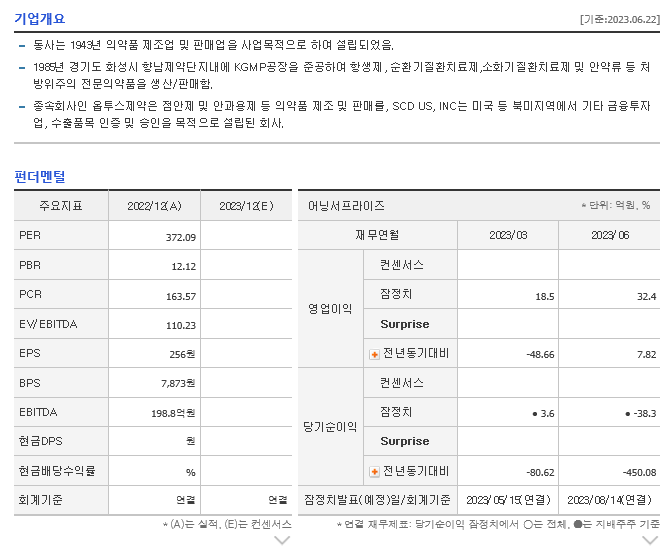 -2023년 3월 전년동기 대비 연결기준 매출액은 5.6% 증가, 영업이익은 48.7% 감소, 당기순이익은 80.6% 감소. 인건비 및 광고선전비 등 판관비가 15% 증가함에 따라 영업이익 및 당기순이익 크게 감소함. 2023년 3월말 아일리아의 바이오시밀러인 'SCD411'의 글로벌 임상 3상 최종 결과 보고서를 수령하고 제품화에 박차를 가하고 있음. 미국과 유럽, 일본 등 주요 국가에 품목허가를 신청할 계획임.