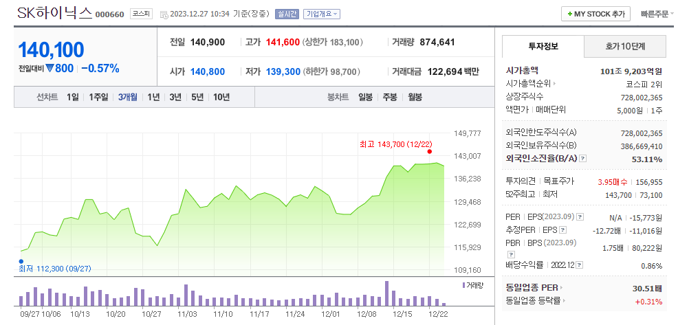 SK하이닉스 현재 주가는 140,900원이며 전일 대비 원의 모습을 보이고 있습니다. SK하이닉스의 주주현황을 살펴보면 에스케이스퀘어(외 9인)이 지분 20.07%를 소유하고 있습니다. SK하이닉스는 반도체 및 관련장비 기업으로 장중 기준으로 주가는 140,900원 입니다. SK하이닉스의 시가 총액은 101조7019억 원이며 발행 주식수는 53.09주 입니다. 외국인 보유 비중은 2,239,789% 이며 장중 거래량은 728,002,365를 기록했습니다. 매출액은 214,602억 원, 영업이익은 68,094억 원을 달성했습니다. EPS는 -11,016원이며 SK하이닉스 주식 배당수익률은 1.60% 입니다.