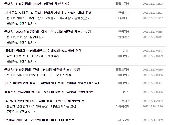 -동사는 1967년 12월에 설립되어 1974년 6월 28일에 유가증권시장에 상장됨. 동사는 자동차 및 자동차부품을 제조 및 판매하는 완성차 제조업체로, 현대자동차그룹에 속하였으며, 현대자동차그룹에는 동사를 포함한 국내 53개 계열회사가 있음. 소형 SUV인 코나, 대형 SUV인 팰리세이드, 제네시스 G80 및 GV80 등을 출시하여 SUV 및 고급차 라인업을 강화 하였으며, 수소전기차 넥소를 출시함.