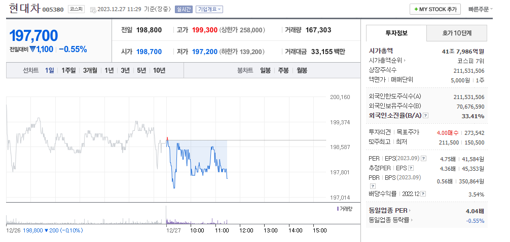 현대차 현재 주가는 198,800원이며 전일 대비 -200원의 모습을 보이고 있습니다. 현대차의 주주현황을 살펴보면 현대모비스(외 9인)이 지분 29.68%를 소유하고 있습니다. 현대차는 자동차 기업으로 장중 기준으로 주가는 198,800원 입니다. 현대차의 시가 총액은 41조8621억 원이며 발행 주식수는 33.39주 입니다. 외국인 보유 비중은 409,928% 이며 장중 거래량은 211,531,506를 기록했습니다. 매출액은 1,210,311억 원, 영업이익은 98,198억 원을 달성했습니다. EPS는 45,353원이며 현대차 주식 배당수익률은 4.64% 입니다.