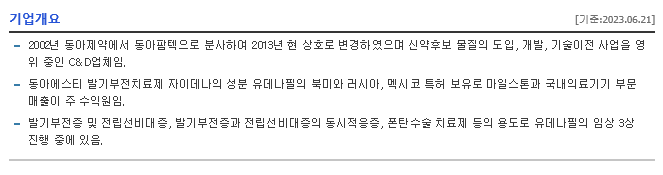 -2002년 동아제약에서 동아팜텍으로 분사하여 2013년 현 상호로 변경하였으며 신약후보 물질의 도입, 개발, 기술이전 사업을 영위 중인 C&D업체임. 동아에스티 발기부전치료제 자이데나의 성분 유데나필의 북미와 러시아, 멕시코 특허 보유로 마일스톤과 국내의료기기 부문 매출이 주 수익원임. 발기부전증 및 전립선비대증, 발기부전증과 전립선비대증의 동시적응증, 폰탄수술 치료제 등의 용도로 유데나필의 임상 3상 진행 중에 있음.