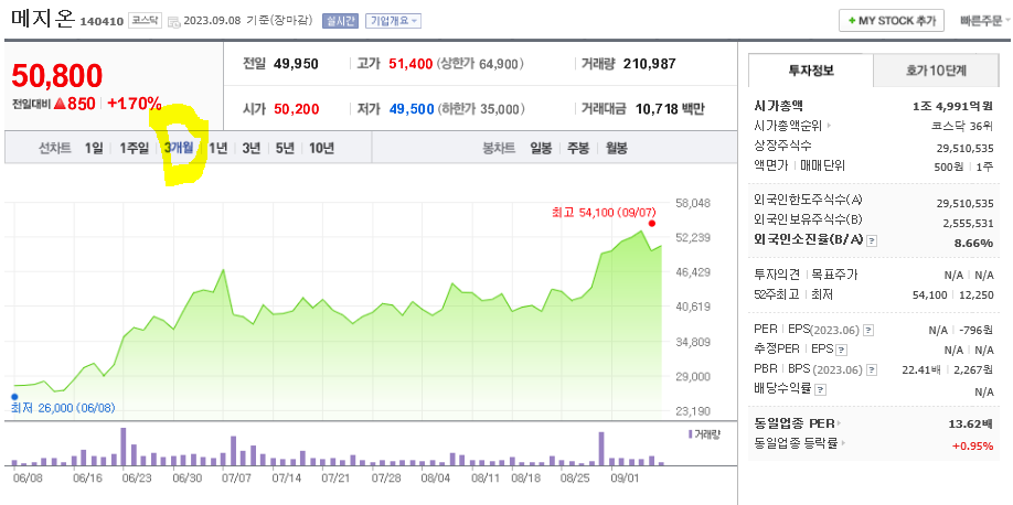 메지온 현재 주가는 50,800원이며 전일 대비 원의 모습을 보이고 있습니다. 메지온의 주주현황을 살펴보면 박동현(외 2인)이 지분 19.44%를 소유하고 있습니다. 메지온는 식료품 기업으로 장중 기준으로 주가는 50,800원 입니다. 삼성전자의 시가 총액은 1조4991억 원이며 발행 주식수는 8.72주 입니다. 외국인 보유 비중은 212,239% 이며 장중 거래량은 29,510,535를 기록했습니다. 매출액은 159억 원, 영업이익은 -233억 원을 달성했습니다. EPS는 없음원이며 메지온 주식 배당수익률은 0.72% 입니다.