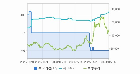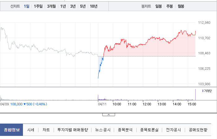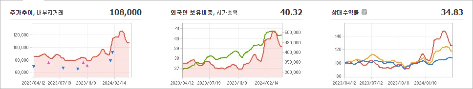 기아의 현재 주가는 108,000원이며 전일 대비 -500원 하락한 상태입니다. 기아의 대주주인 현대자동차(외 4인)은 지분의 35.92%를 소유하고 있습니다. 또한, 기아의 시가 총액은 44조 9083억 원이며 발행 주식수는 402,044,203주입니다. 외국인 보유 비중은 40.32%이며, 장중 거래량은 1,652,638주를 기록했습니다. 기아의 매출액은 998,084억 원으로 달성되었습니다.