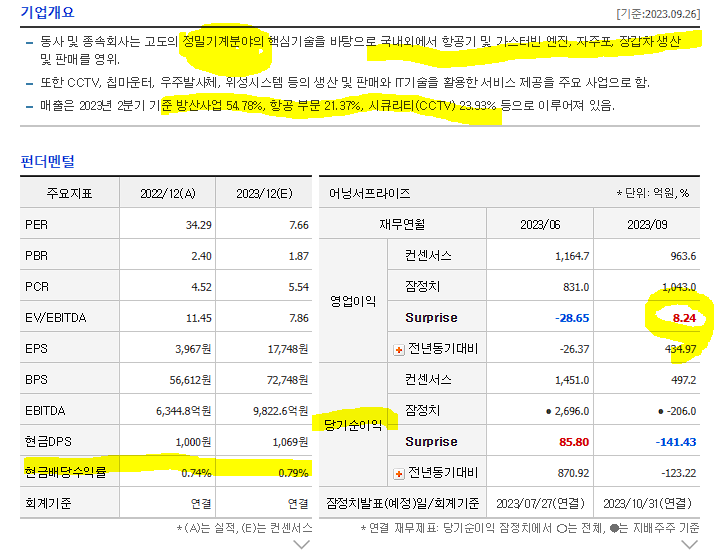 -동사 및 종속회사는 고도의 정밀기계분야의 핵심기술을 바탕으로 국내외에서 항공기 및 가스터빈 엔진, 자주포, 장갑차 생산 및 판매를 영위. 또한 CCTV, 칩마운터, 우주발사체, 위성시스템 등의 생산 및 판매와 IT기술을 활용한 서비스 제공을 주요 사업으로 함. 매출은 2023년 2분기 기준 방산사업 54.78%, 항공 부문 21.37%, 시큐리티(CCTV) 23.93% 등으로 이루어져 있음.