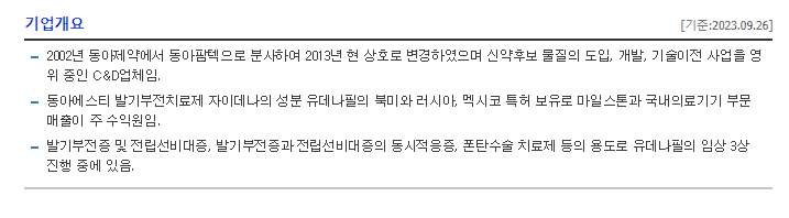 -2002년 동아제약에서 동아팜텍으로 분사하여 2013년 현 상호로 변경하였으며 신약후보 물질의 도입, 개발, 기술이전 사업을 영위 중인 C&D업체임. 동아에스티 발기부전치료제 자이데나의 성분 유데나필의 북미와 러시아, 멕시코 특허 보유로 마일스톤과 국내의료기기 부문 매출이 주 수익원임. 발기부전증 및 전립선비대증, 발기부전증과 전립선비대증의 동시적응증, 폰탄수술 치료제 등의 용도로 유데나필의 임상 3상 진행 중에 있음.