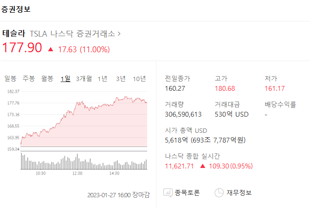 22년도 1,2분기에서 좋지 못한 성장세에 머무르다가 3분기 흑자 3.2%를 달성하며 2분기에 + 수익으로 성장세를 보여주어 23년도의 시작은 좋은 흐름을 나타내고 있는데요. 100 초반에 매수하셨던 분들은 150 정도에서 매도하여 50%가량의 수익을 실현하셨을 것 같습니다. 앞으로 테슬라의 1년간 주가 전망을 내다본 전문가들은 최저 86 - 최고 436까지 내다보고 있고, 시가총액만 살펴본다면 단연 상위에 있다고 할 수 있습니다.