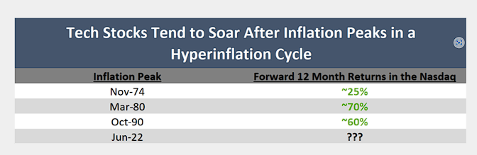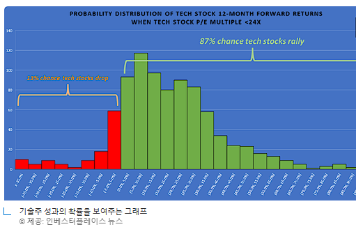 과거의 흐름에서 74년도에 인플레이션이 가장 치솟은 달 그 이후로 기술주는 25%라는 상승세를 보였고, 80년도의 인플레 최대치 이후 70%라는 상승세가 12개월간 나타났다는 점에서 22년도 6월 인플레가 최고치였기에 23년도의 기술주는 상승세를 보일 것으로 예상된다는 것 이죠.
