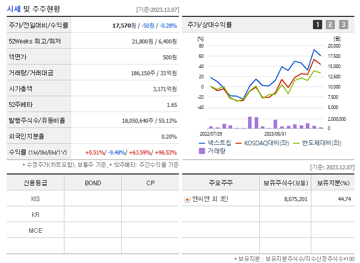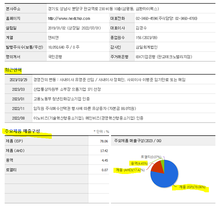넥스트칩는 반도체 및 관련장비 기업입니다. 대표자는 김경수 이며 설립일은 2019/01/02, 주식 상장일은 2022/07/01입니다. 전체 종업원 수는156명 이고 본사 주소는 경기도 성남시 분당구 판교역로 230 비동 10층(삼평동, 삼환하이펙스)입니다.