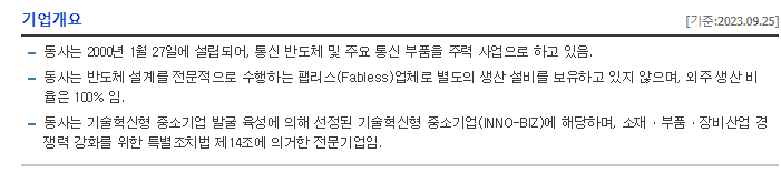 -동사는 2000년 1월 27일에 설립되어, 통신 반도체 및 주요 통신 부품을 주력 사업으로 하고 있음. 동사는 반도체 설계를 전문적으로 수행하는 팹리스(Fabless)업체로 별도의 생산 설비를 보유하고 있지 않으며, 외주 생산 비율은 100% 임. 동사는 기술혁신형 중소기업 발굴 육성에 의해 선정된 기술혁신형 중소기업(INNO-BIZ)에 해당하며, 소재ㆍ부품ㆍ장비산업 경쟁력 강화를 위한 특별조치법 제14조에 의거한 전문기업임.