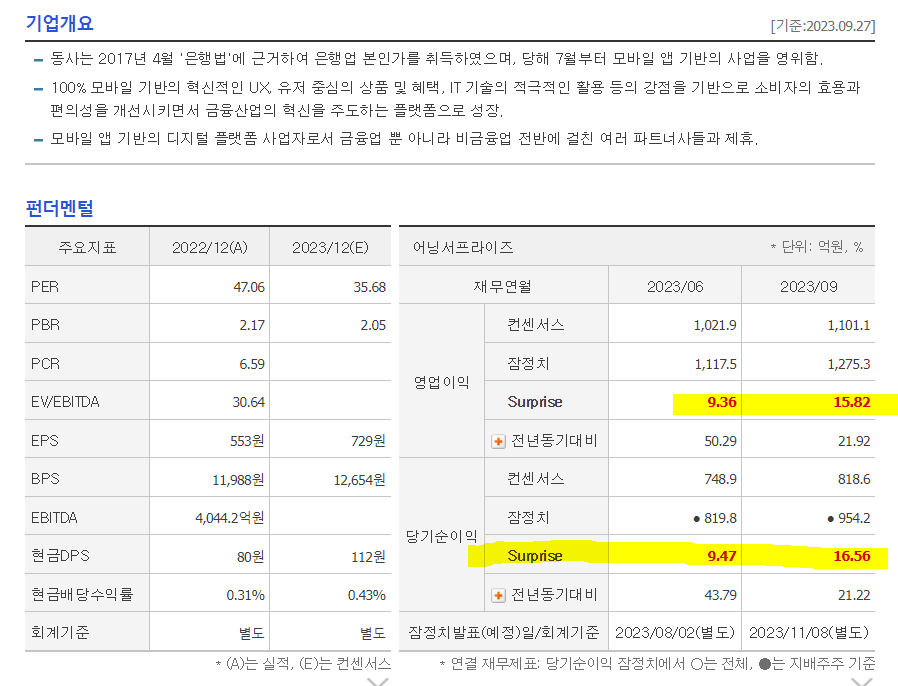 -2023년 6월 전년동기 대비 별도기준 매출액은 65.5% 증가, 영업이익은 52.5% 증가, 당기순이익은 48.5% 증가. 2분기 NIM하락폭이 컸으나 주택담보대출을 필두로 높은 대출성장률을 보여줌. 4대보험과 광고선전비 등 판관비는 소폭 증가함. 2023년 2분기 기준 고객수는 2174만명으로 증가했고, MAU도 1,735만으로 시장 리드 중임. 플랫폼 비즈니스의 영향력 강화됨.