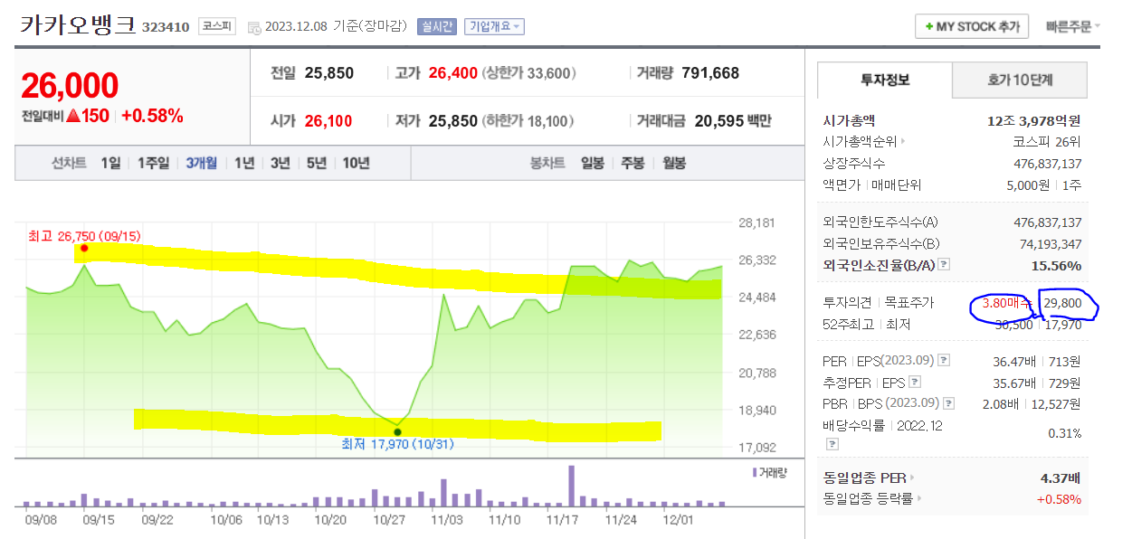 이 글에서는 카카오뱅크 주가 전망과 목표 주가, 기업 정보에 대해서 설명합니다. 주식 투자의 중심은 미래의 기업 가치를 예측하고 선제적으로 움직이는 것입니다. 투자할 종목을 고르기 전에 현재 기업 상태와 지표를 살펴야 합니다. 카카오뱅크 주식의 주요 현황과 투자 정보를 확인하시고 주식 투자에 유용한 정보들을 한 곳에 정리해두었으니 투자 전에 확인하시기 바랍니다..
