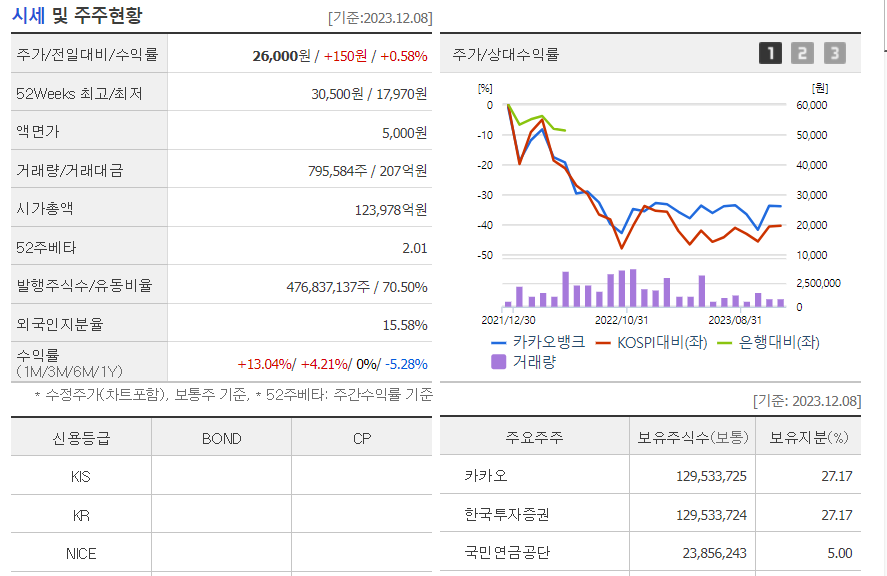 카카오뱅크 현재 주가는 26,000원이며 전일 대비 -5.28원의 모습을 보이고 있습니다. 카카오뱅크의 주주현황을 살펴보면 이 지분 27.17%를 소유하고 있습니다. 카카오뱅크는 상업은행 기업으로 장중 기준으로 주가는 26,000원 입니다. 삼성전자의 시가 총액은 12조3978억 원이며 발행 주식수는 15.58주 입니다. 외국인 보유 비중은 795,584% 이며 장중 거래량은 476,837,137를 기록했습니다. 매출액은 8,047억 원, 영업이익은 억 원을 달성했습니다. EPS는 727원이며 카카오뱅크 주식 배당수익률은 0.33% 입니다.