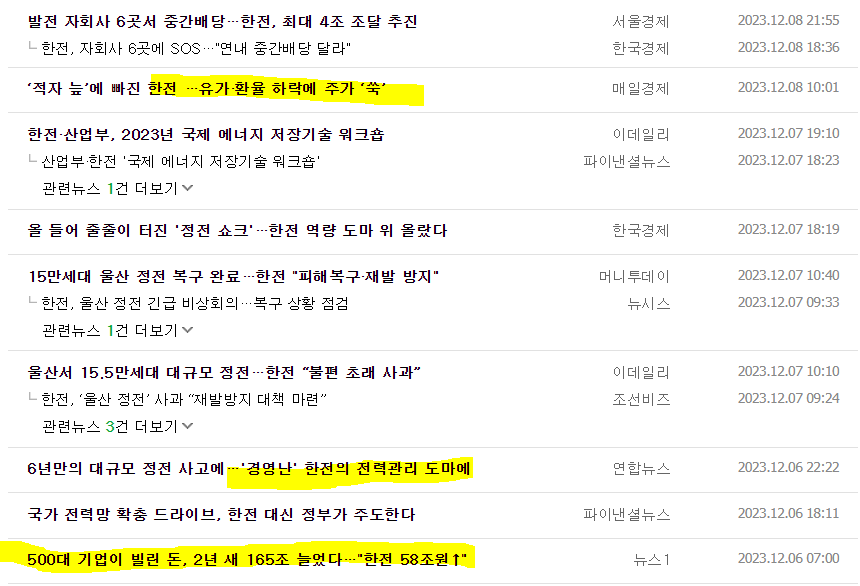 -2023년 6월 전년동기 대비 연결기준 매출액은 28.8% 증가, 영업손실은 40.9% 감소, 당기순손실은 36.5% 감소. 지난 1월 요금조정 시 반영하지 못한 2022년 연료비 증가분 중 일부는 5월 16일부터 전력량요금을 8.0원/kWh 인상하여 반영하였음. 2023년도 상반기 회사가 구입한 전력의 총 평균단가는 148.53원/kWh이며 회사는 구입전력비를 최소화하기 위해 전력거래소와 정부에 적극적으로 의견을 개진중임.