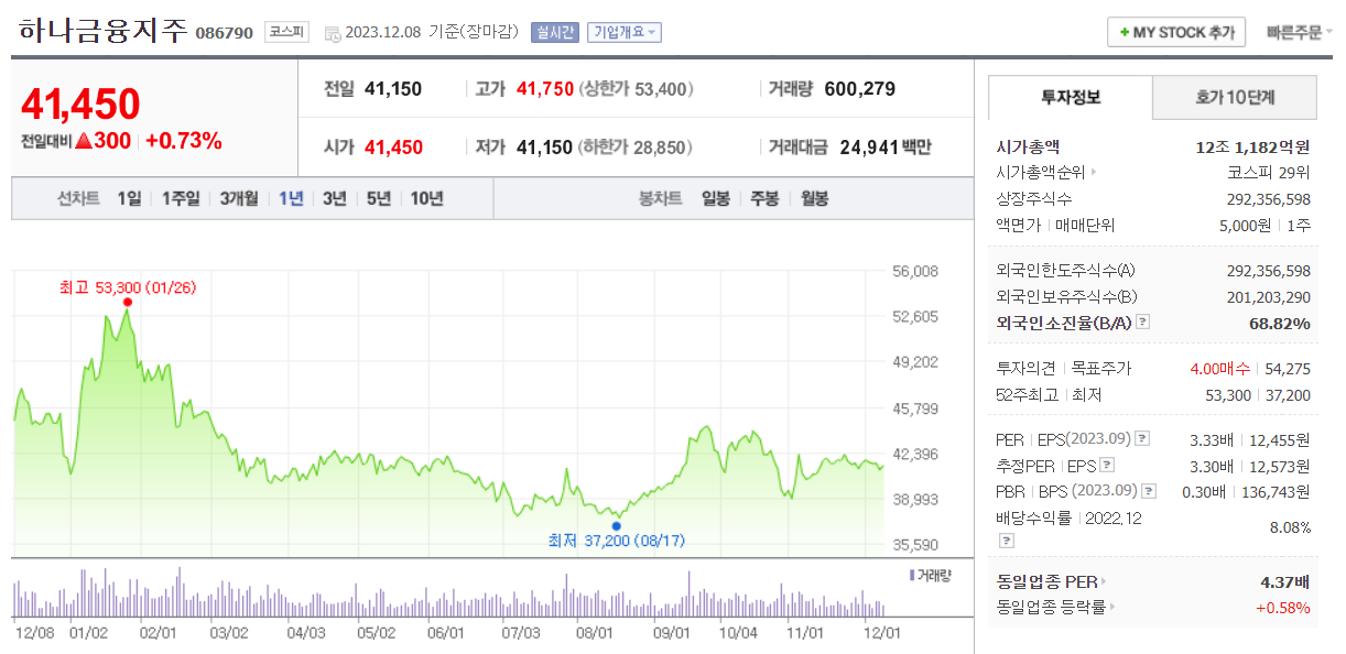 이 글에서는 하나금융지주 주가 전망과 목표 주가, 기업 정보에 대해서 설명합니다. 주식 시장에서 중요한 것은 미래의 기업 가치를 예측하고 선제적으로 움직이는 것입니다. 투자 대상을 선택하기 전에 현재 기업의 현황과 데이터를 확인하는 것이 필요합니다. 하나금융지주 주식의 주요 현황과 투자 정보를 확인하시고 주식 투자에 도움을 줄 자료들을 모아 두었으니 투자 결정에 도움을 받으시길 바랍니다..