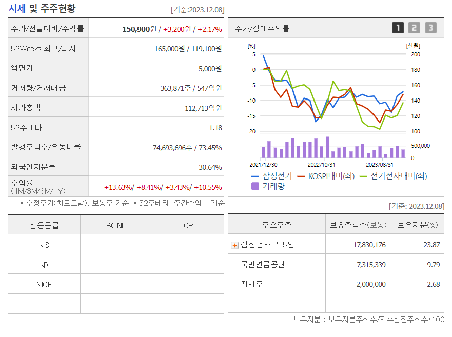 삼성전기 현재 주가는 150,900원이며 전일 대비 원의 모습을 보이고 있습니다. 삼성전기의 주주현황을 살펴보면 삼성전자(외 5인)이 지분 23.87%를 소유하고 있습니다. 삼성전기는 전자 장비 및 기기 기업으로 장중 기준으로 주가는 150,900원 입니다. 삼성전자의 시가 총액은 11조2713억 원이며 발행 주식수는 30.64주 입니다. 외국인 보유 비중은 363,871% 이며 장중 거래량은 74,693,696를 기록했습니다. 매출액은 66,032억 원, 영업이익은 11,828억 원을 달성했습니다. EPS는 6,137원이며 삼성전기 주식 배당수익률은 1.61% 입니다.