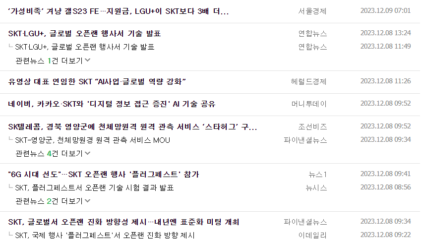 -2023년 6월 전년동기 대비 연결기준 매출액은 1.3% 증가, 영업이익은 7.4% 증가, 당기순이익은 33.2% 증가. 주력인 무선통신부문의 실적 확대와 함께 초고속 인터넷 등 유선부문의 선전으로 영업수익 확대됨. 원가율 또한 개선되며 영업수익성 또한 상승한 모습. 실적 개선을 위해 5G 통신망 구축을 주도하고 빅데이터, AI를 접목한 서비스를 선보이는 등 다방면으로 노력 중임.