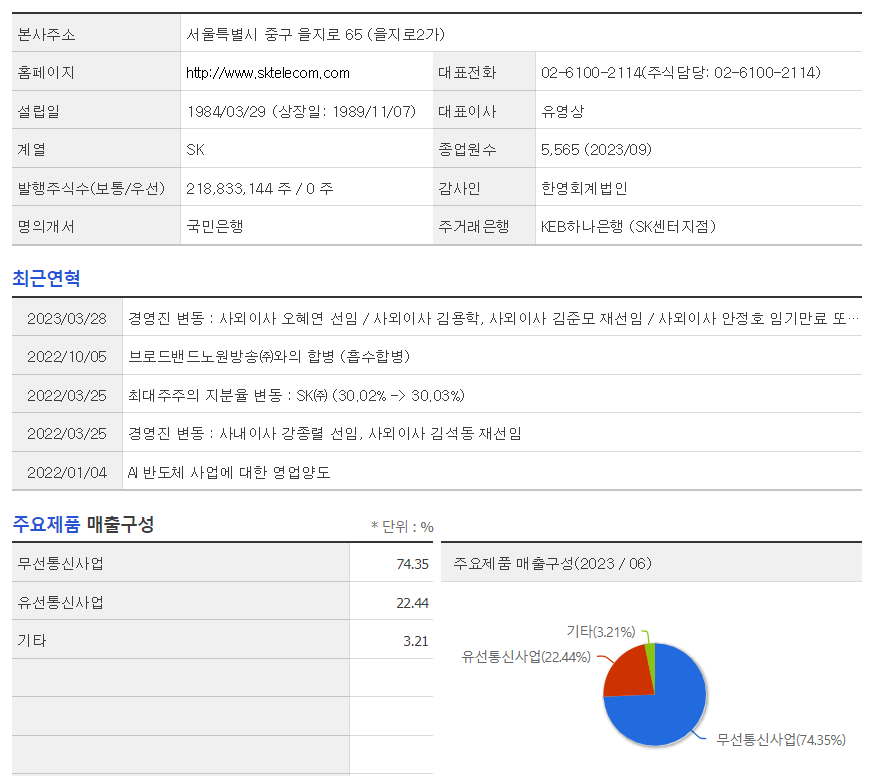 SK텔레콤는 무선통신 기업입니다. 대표자는 유영상 이며 설립일은 1984/04/20, 주식 상장일은 1989/11/07입니다. 전체 종업원 수는5,565명 이고 본사 주소는 서울시 중구 을지로 65 SK T타워입니다.