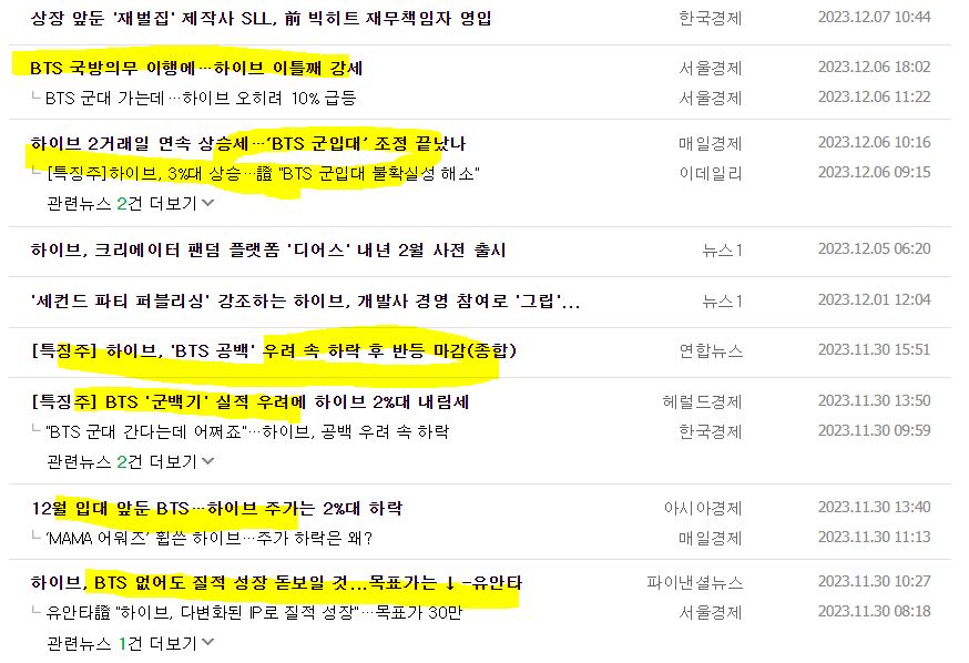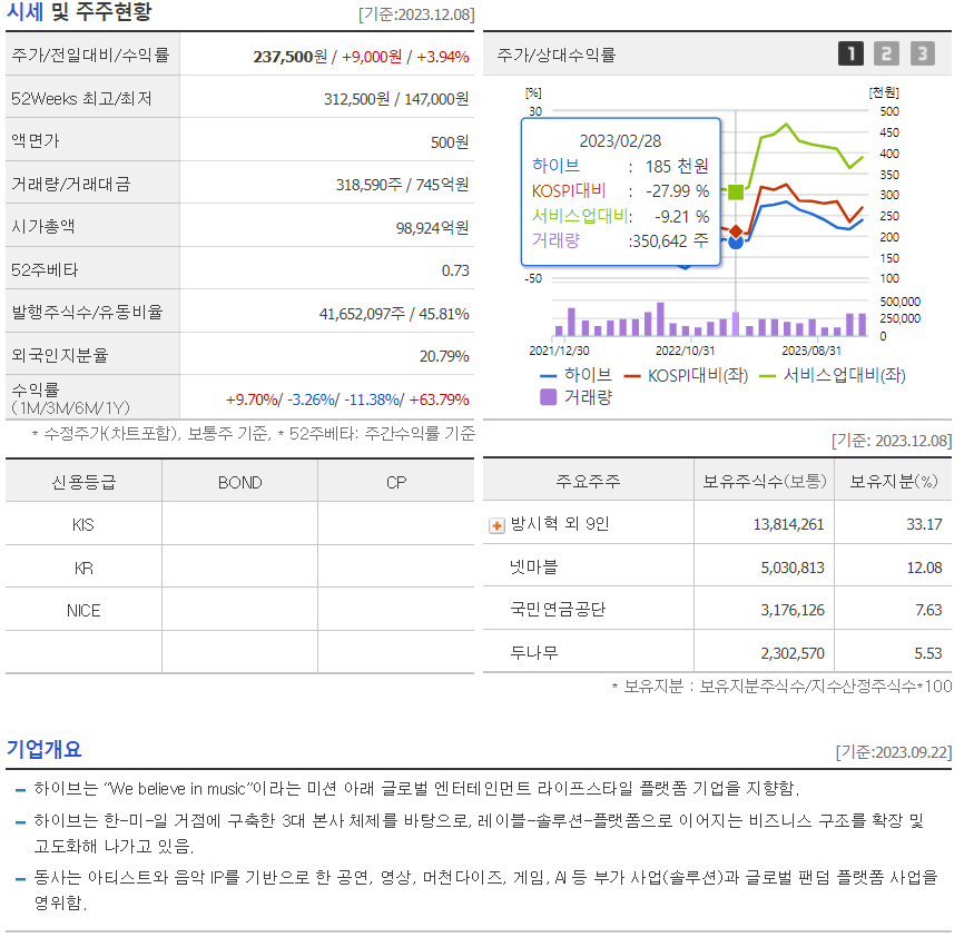 -2023년 6월 전년동기 대비 연결기준 매출액은 29.4% 증가, 영업이익은 6.8% 증가, 당기순이익은 8.7% 증가. 앨범, 공연, 광고, 콘텐츠 등 전 분야에서 전년동기 상회하였으며 앨범 판매량은 상반기만으로도 2022년 22.2백만장을 상회하는 22.7백만장을 기록함. 방탄소년단, 투모로우바이투게더, 르세라핌, 뉴진스 라인업의 다양화에 더불어 지속적인 흥행으로 인증된 신인 라인업도 기대해 볼 수 있음.