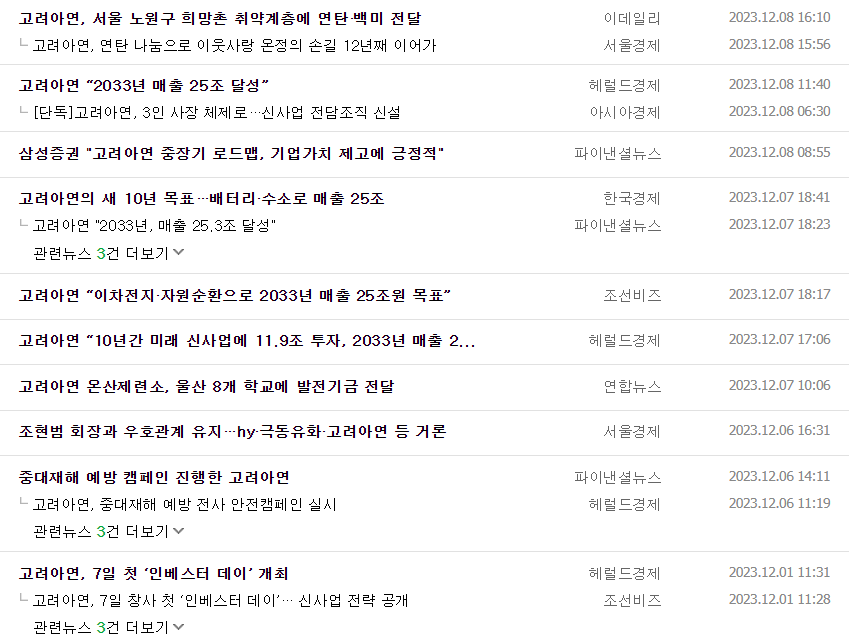 -2023년 6월 전년동기 대비 연결기준 매출액은 9.4% 감소, 영업이익은 54.7% 감소, 당기순이익은 42% 감소. 전체 매출에서 37%의 비중을 차지하는 아연 수요가 줄어들며 2분기 아연 평균 가격은 톤당 2540달러로 전년 동기 대비 35% 하락함. 아연 제조 비용도 늘어난 데다, 세계 최대 철 생산국인 중국이 감산을 본격화함에 따라 아연 수요는 향후 더욱 줄어들 것으로 전망됨.