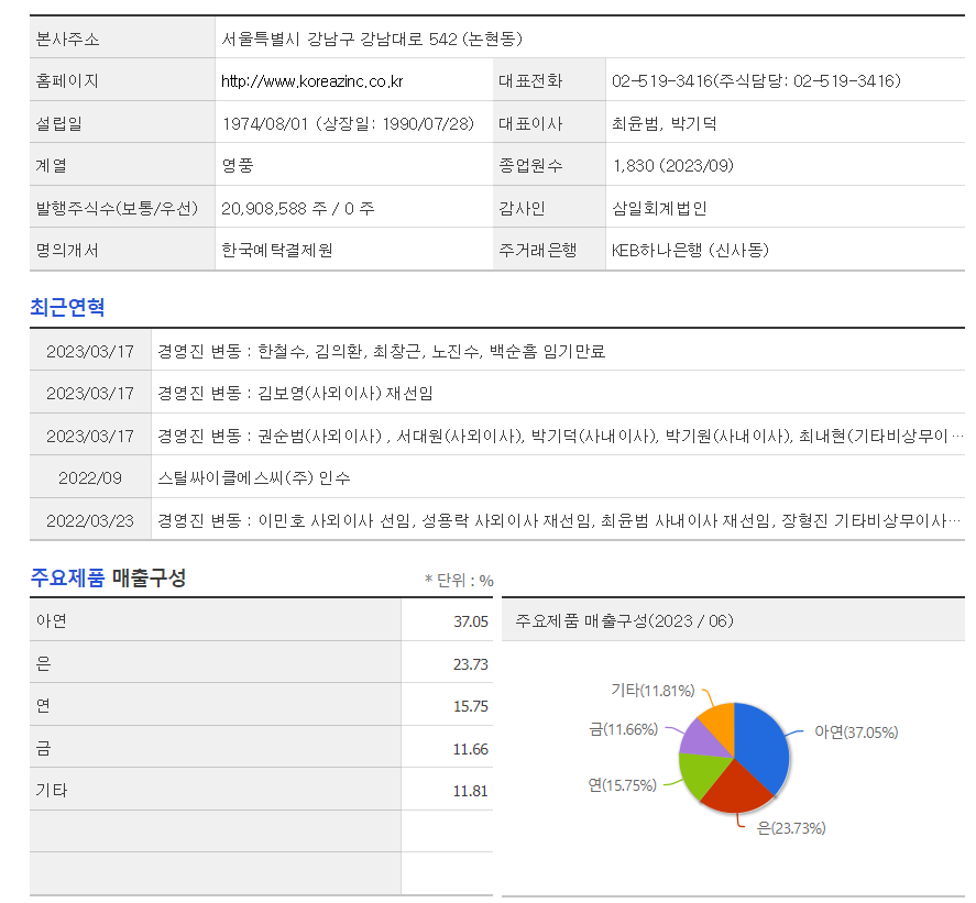 고려아연는 금속 및 광물 기업입니다. 대표자는 최윤범, 박기덕 이며 설립일은 1974/08/01, 주식 상장일은 1990/07/28입니다. 전체 종업원 수는1,830명 이고 본사 주소는 서울시 강남구 강남대로 542 (논현동), 영풍빌딩입니다.