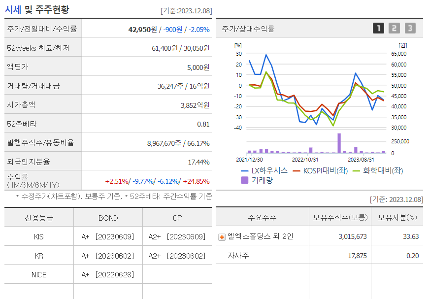 LX하우시스 현재 주가는 42,950원이며 전일 대비 -900원의 모습을 보이고 있습니다. LX하우시스의 주주현황을 살펴보면 엘엑스홀딩스(외 2인)이 지분 33.63%를 소유하고 있습니다. LX하우시스는 건축자재 기업으로 장중 기준으로 주가는 42,950원 입니다. 삼성전자의 시가 총액은 3852억 원이며 발행 주식수는 17.44주 입니다. 외국인 보유 비중은 36,247% 이며 장중 거래량은 8,967,670를 기록했습니다. 매출액은 26,431억 원, 영업이익은 149억 원을 달성했습니다. EPS는 8,443원이며 LX하우시스 주식 배당수익률은 0.64% 입니다.