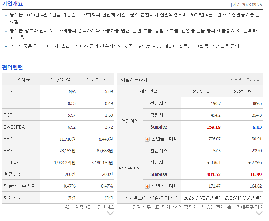 -동사는 2009년 4월 1일을 기준일로 LG화학의 산업재 사업부문이 분할되어 설립되었으며, 2009년 4월 2일자로 설립등기를 완료함. 동사는 창호와 인테리어 자재등의 건축자재와 자동차용 원단, 일반 부품, 경량화 부품, 산업용 필름 등의 제품을 제조, 판매하고 있음. 주요제품은 창호, 바닥재, 솔리드서피스 등의 건축자재와 자동차소재/원단, 인테리어 필름, 데코필름, 가전필름 등임.