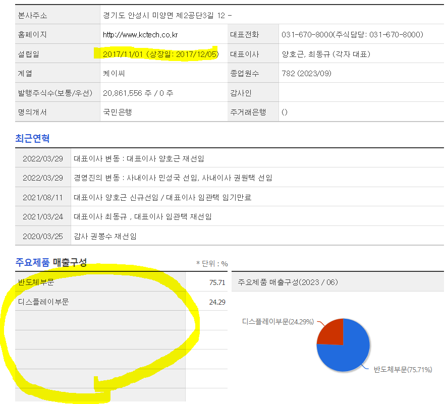 -동사는 2017년 케이씨로부터 인적분할로 설립되어 반도체, 디스플레이 장비 및 소재 사업 부분을 영위함. 반도체 전공정 장비 및 소모성 재료의 제조 및 판매를 주력사업으로 영위하고 있으며, 반도체 CMP, 세정장비/디스플레이 Wet-station 및 Coater 장비, 반도체 Slurry 등 라인업을 갖추고 있음. 매출구성은 반도체부문 74%, 디스플레이부문 26% 등으로 이루어져 있음.