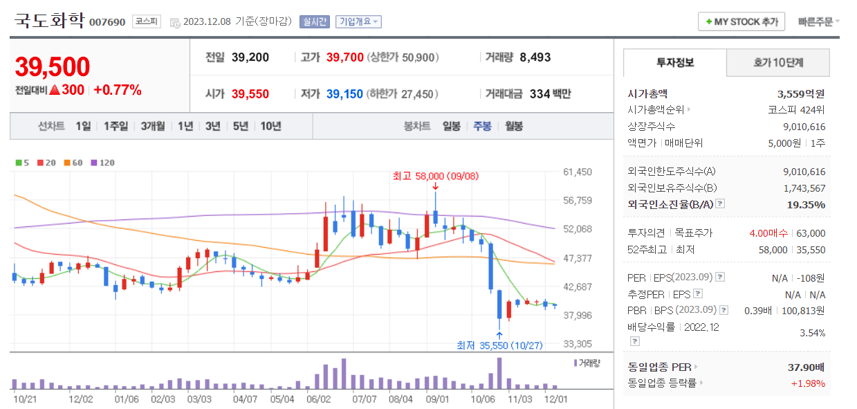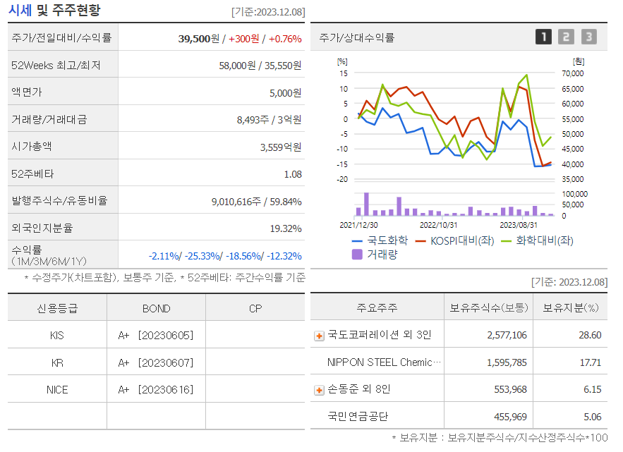 국도화학 현재 주가는 39,500원이며 전일 대비 -2.11원의 모습을 보이고 있습니다. 국도화학의 주주현황을 살펴보면 국도코퍼레이션(외 3인)이 지분 28.60%를 소유하고 있습니다. 국도화학는 화학 기업으로 장중 기준으로 주가는 39,500원 입니다. 삼성전자의 시가 총액은 3559억 원이며 발행 주식수는 19.32주 입니다. 외국인 보유 비중은 8,493% 이며 장중 거래량은 9,010,616를 기록했습니다. 매출액은 10,060억 원, 영업이익은 969억 원을 달성했습니다. EPS는 2,625원이며 국도화학 주식 배당수익률은 3.27% 입니다.