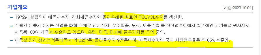 -1972년 설립되어 에폭시수지, 경화제용수지와 폴리우레탄 원료인 POLYOL수지를 생산함. 주력인 에폭시수지는 산업용 화학 소재로 전기전자, 우주항공, 도료, 토목건축 등 전산업분야에서 필수적인 고기능성 원자재로 사용됨. 60여 개국에 수출하고 있으며, 유럽, 미국, 터키에 물류기지를 운영 중임. 제품별 연간 생산능력은에폭시 약 62만톤, 폴리올수지 9만톤이며, 에폭시수지의 국내 시장점유율은 약 65% 수준임.