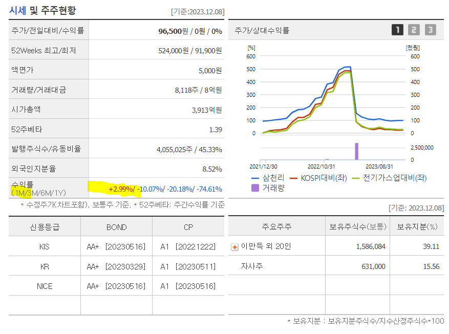 삼천리 현재 주가는 96,500원이며 전일 대비 -10.07원의 모습을 보이고 있습니다. 삼천리의 주주현황을 살펴보면 이만득(외 20인)이 지분 39.11%를 소유하고 있습니다. 삼천리는 가스 기업으로 장중 기준으로 주가는 96,500원 입니다. 삼성전자의 시가 총액은 3913억 원이며 발행 주식수는 8.52주 입니다. 외국인 보유 비중은 8,118% 이며 장중 거래량은 4,055,025를 기록했습니다. 매출액은 41,350억 원, 영업이익은 912억 원을 달성했습니다. EPS는 4,439원이며 삼천리 주식 배당수익률은 0.67% 입니다.