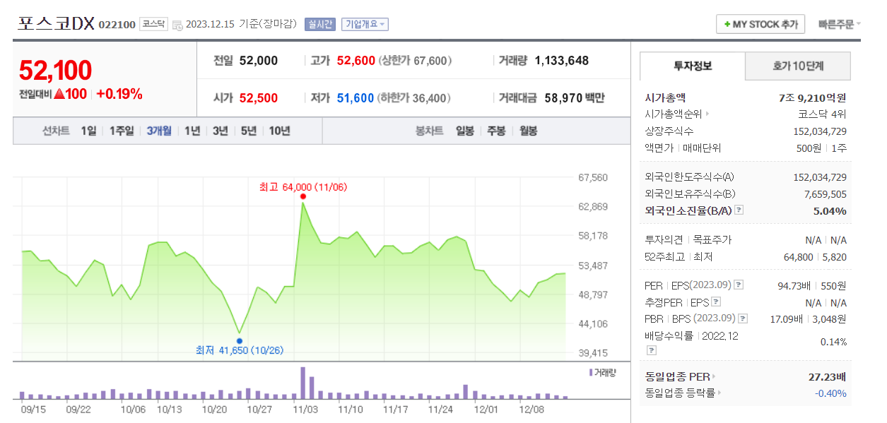 포스코DX 현재 주가는 52,100원이며 전일 대비 -8.27원의 모습을 보이고 있습니다. 포스코DX의 주주현황을 살펴보면 포스코홀딩스(외 3인)이 지분 66.29%를 소유하고 있습니다. 포스코DX는 IT 서비스 기업으로 장중 기준으로 주가는 52,100원 입니다. 포스코DX의 시가 총액은 7조9210억 원이며 발행 주식수는 5.04주 입니다. 외국인 보유 비중은 1,147,884% 이며 장중 거래량은 152,034,729를 기록했습니다. 매출액은 11,302억 원, 영업이익은 647억 원을 달성했습니다. EPS는 없음원이며 포스코DX 주식 배당수익률은 1.20% 입니다.