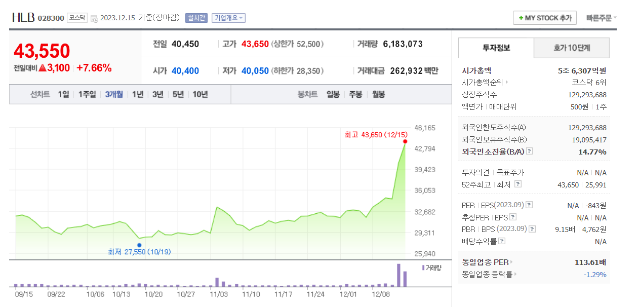 HLB 현재 주가는 43,550원이며 전일 대비 원의 모습을 보이고 있습니다. HLB의 주주현황을 살펴보면 진양곤(외 7인)이 지분 9.71%를 소유하고 있습니다. HLB는 제약 기업으로 장중 기준으로 주가는 43,550원 입니다. HLB의 시가 총액은 5조6307억 원이며 발행 주식수는 15.33주 입니다. 외국인 보유 비중은 6,501,347% 이며 장중 거래량은 129,293,688를 기록했습니다. 매출액은 339억 원, 영업이익은 -747억 원을 달성했습니다. EPS는 없음원이며 HLB 주식 배당수익률은 56,307% 입니다.